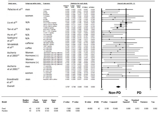 - Hong, C.T.; Chan, L.; Bai, C.-H. The Effect of Caffeine on the Risk and Progression of Parkinson’s Disease: A Meta-Analysis. Nutrients 2020, 12, 1860. [Google Scholar] [CrossRef] [PubMed]