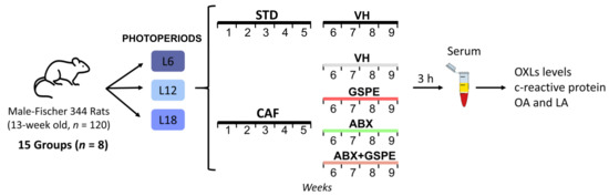 Experimental design. A total of 120 13-week-old male Fischer 344 rats were pair-housed under three different photoperiods (6, 12, or 18 h of light per day) and fed a STD or CAF for 9 weeks. During the last 4 weeks, animals were daily administered with either an oral dose of GSPE (grape seed proanthocyanidin extract) (25 mg/kg) dissolved in a solution of water and condensed milk (5:1, VH), or a combination of GSPE and an antibiotic cocktail (ABX) in drinking water (ampicillin: 0.5 g/L, vancomycin: 0.25 g/L, imipenem: 0.125 g/L). Vehicle and ABX-treated animals were included as controls. L6: 6 h light/18 h darkness; L12: 12 h light/12 h darkness; L18: 18 h light/6 h darkness; STD: standard chow diet; CAF: cafeteria diet; VH: vehicle; OXLs: oxylipins; OA: oleic acid; LA: linoleic acid.