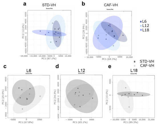 OXLs profile was influenced by the different photoperiod in healthy and obese rats and CAF feeding effect on OXLs profile was different according to the photoperiod exposure. (a to b): Photoperiod effect on (a): healthy rats (STD-VH); and (b): CAF-induced obese rats (CAF-VH) plotted as principal component analysis (PCA). (c to d): Diet effect in (c): L6; (d): L12; and (e): L18 conditions throughout PCA. (n = 5).