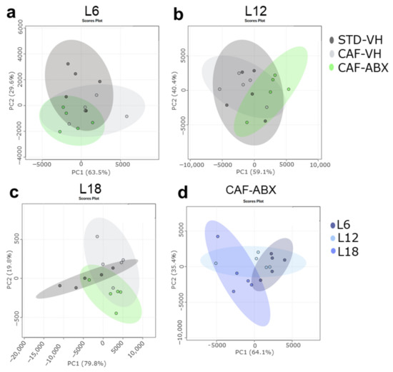 OXLs profile was influenced by the gut microbiota in a photoperiod-dependent manner. (a–c): ABX effect in (a): L6; (b): L12; and (c): L18 conditions throughout Principal Component Analysis (PCA); (d): Photoperiod effect on CAF-ABX-treated rats. (n = 5).