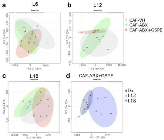 GSPE mitigated ABX-mediated effect on OXLs profile only under L18 conditions. (a–c): ABX + GSPE effect in obese rats in (a): L6; (b): L12; and (c): L18 conditions throughout principal component analysis (PCA); (d): Photoperiod effect on CAF-ABX + GSPE rats. (n = 5).