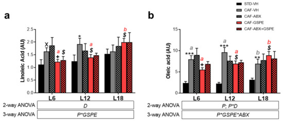 We also investigated the effects of GSPE, diet, and ABX in LA and OA, OXLs precursors. We found that CAF feeding affected LA and OA serum levels depending on the photoperiod conditions (P*D p < 0.05) (Figure 7). Thus, obese rats showed significant higher levels of LA under both L6 (p < 0.05) and L12 (p < 0.05) compared to healthy rats. However, obese rats under L18 did not show any diet effect, showing the same levels of these fatty acids than STD-fed rats (p > 0.05) (Figure 7a,b). In contrast, OA levels were significantly higher in obese rats compared to healthy rats independently of the photoperiod conditions (p < 0.05) (Figure 7b). In this context, OA levels showed an interesting photoperiod effect, their levels under L18 being lower in comparison with L12 conditions (p < 0.05) (Figure 7b).