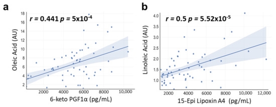 Correlations analyzed by Pearson’s rank correlation coefficient (r). Simple linear regression analysis of the significant observed correlation between: (a); 6-keto PGF1α and OA levels and (b) 15-Epi-Lipoxin A4 and LA levels d. (n = 7–8). AU: arbitrary units.