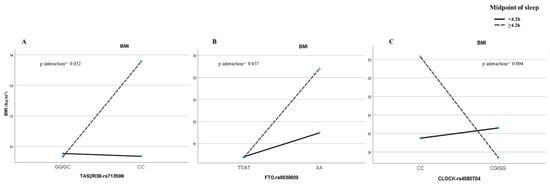Polymorphism interactions with midpoint of sleep. (A) BMI values according to midpoint of sleep by genotypes in TAS2R38-rs71359. (B) BMI values according to midpoint of sleep separated by G-allele carriers and AA genotype in FTO-rs9939609. (C) BMI values according to midpoint of sleep by genotypes in CLOCK-rs4580704. BMI: body mass index.