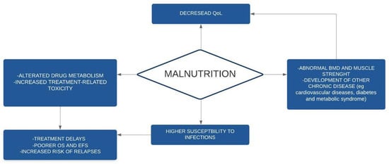Undernutrition during treatments can negatively impact the tolerance of CHT, OS, EFS, risk of infection, and QoL [].