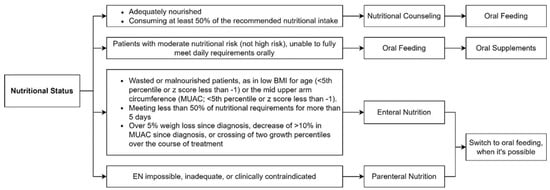 EN is not always possible, such as in pediatric patients with GI obstruction or paralytic ileus, intractable vomiting or diarrhea, severe mucositis, intestinal GVHD, acute hemorrhage, severe pancreatitis, radiation enteritis, or GI perforation [,]. PN should be considered if EN is impossible, inadequate, or clinically contraindicated []. A retrospective study by Bendelsmith et al. investigated the use of EN in pediatric patients with newly diagnosed high-grade CNS tumors, medulloblastoma, or primitive neuro-ectodermal tumors (PNETs) []. The study highlighted that proactive enteral tube feeding led to a substantial increase in weight over the first year of treatment. Conversely, children who received rescue enteral tube feeding secondary to weight loss suffered a weight reduction and then regained it after the start of EN. Those who had not started EN even after losing weight had not regained the weight loss by the end of the follow-up. As a result, this study confirms the benefit of proactive enteral tube feeding []. In Figure 3, a scheme of possible nutritional interventions based on NS is provided.