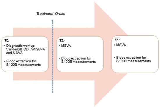 We decided to use the QA/SA scores from the MSVA as objective indicators of the clinical response to therapy, based on previous studies reporting on the effects of MPH and ω-3 PUFAs on omission and commission errors [,]. Application of MSVA and blood extractions for S100B measurement were performed at three specific time points over a six-month follow-up period: at baseline (T0); three months after starting treatment (T3); and six months after treatment onset (T6) (Figure 1). The timeframe was chosen based on the accretion time of ω-3 PUFAs, which is reported to be higher than eight weeks [].