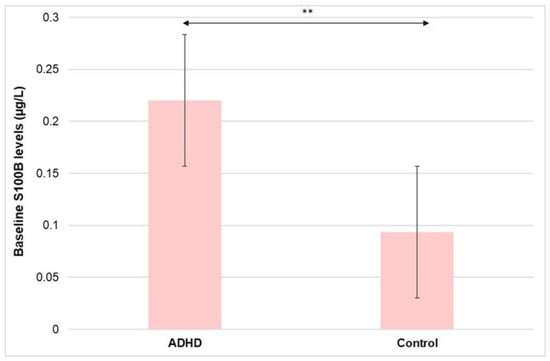 Variations in S100B levels have been associated with neuropsychiatric diseases for which a redox imbalance and inflammatory basis are proposed []. Significant differences in S100B and high mobility group box 1 (HMGB1) concentrations were observed between patients with schizophrenia and controls []; in fact, an inverse correlation was found between S100B levels and the Positive and Negative Syndrome Scale (PANSS) score at discharge after acute relapses of paranoid schizophrenia []. In transgenic mice, higher serum S100B levels were related to brain-region-specific and sex-dependent amyloid-β deposition, suggesting a role of S100B in the pathophysiology of Alzheimer’s disease [,]. In children with autism spectrum disorders (ASD), a neurodevelopmental condition highly related to ADHD, peripheral blood S100B concentrations were reported to be significantly increased compared with controls [,].