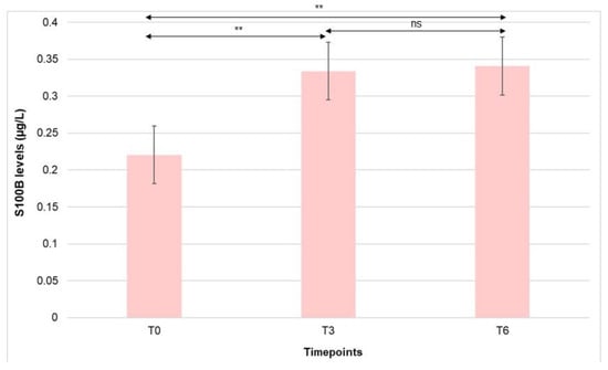 Comparative analysis of serum S100B levels at the different time points (T0, T3, T6) in the ADHD group. ns: non-significant; ** p < 0.001.