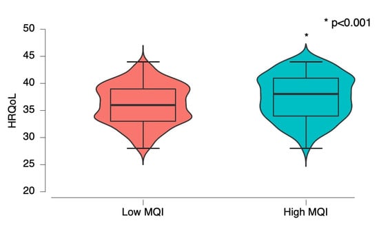 According to MQI levels, high-MQI groups reported higher HRQoL than the low-MQI group (low MQI: 36.10 ± 3.63 vs. high MQI: 37.43 ± 4.00, p < 0.001) (Figure 1).