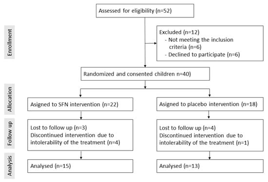 A total of 40 children qualified for our study and were randomized (Figure 1). Five children dropped out due to intolerability of the preparate. Seven children were lost to follow-up and were excluded from the study analyses. Twenty-eight children completed the study, and their data were used for statistical analyses. The characteristics of the children who provided all follow-up data are shown in Table 1. All children had a diagnosis of ASD; approximately 80% were male, the mean age was 4.4 years, and there was no record of known genetic conditions or chronic disease among the children. The treatment with SFN was well-tolerated. No side or adverse effects were recorded.