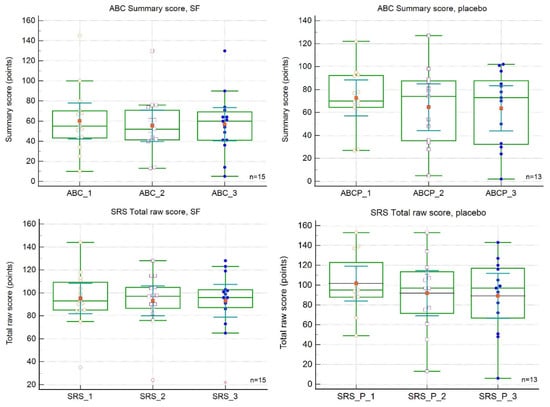 Numerous studies have revealed that placebo effects can affect the information capability of rating scales assessed by parents or caregivers []. The reliability of the methods used might thus be questioned, as two parent- or caregiver-reported questionnaires (ABC and SRS-2) were collected at each visit. However, the study was double-blinded, and neither objective evidence of efficacy (ADOS-2) assessed by trained professionals reported any significant benefit of SFN. Thus, we consider this possibility marginal. A limitation of our project included its small sample size with a limited age span. Another source of weakness in this study was that the outcomes were derived from three scales only. It would be beneficial to use different scales with distinguished psychometric properties to evaluate the treatment effects more complexly. The comparability of the data was also impacted by our own unique SFN formula preparation, although the SFN content and stability have been thoroughly analysed. Other aspects, such as population heterogeneity or geographic differences in the gut microbiota composition with an impact on crosstalk between the gut–brain axis and supposed SFN-mediated reduction of oxidative stress in the brain, may be mentioned [,,]. However, none of these factors should represent a decisive factor indicating the absence of an effect of SFN supplementation in our study.
