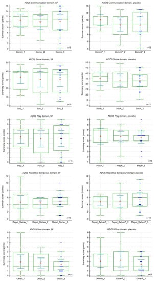 Effect of sulforaphane treatment on Autism Diagnostic Observation Schedule-2 (ADOS-2) subscale scores. SFN, sulforaphane group. Red dots represent score means.