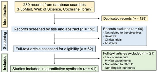 This study selected reliable literature for meta-analysis according to the flow described in Figure 1. A total of 280 records were initially screened from the PubMed, Web of Science, and Cochrane Library databases, and 128 duplicates were removed. According to the prescribed exclusion criteria, 90 studies that were not related to the present study, review articles, or clinical trials were additionally removed based on the contents of their titles and abstracts. After a careful review of 62 full-text articles, a total of 41 studies were included in the final analysis (Figure 1).