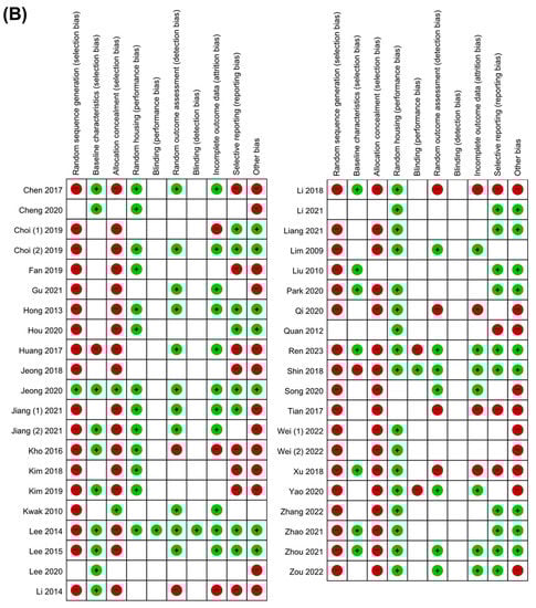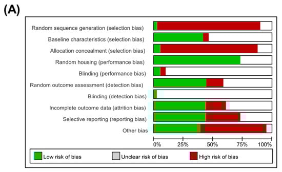 Quality assessment of included studies based on the SYRCLE’s risk of bias tool. (A) A graph of the risk in the bias of included studies. (B) A summary of the risk of bias in the included studies [,,,,,,,,,,,,,,,,,,,,,,,,,,,,,,,,,,,,,,,,].