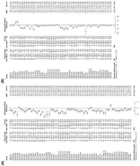 The present meta-analysis was performed with ReviewManager (RevMan 5.4; London, UK) and R software (version 4.2.1; R foundation, Inc. (Indiana, IN, USA); http://cran.r-project.org (accessed on 1 December 2022). The standardized mean difference (SMD) with a 95% confidence interval (CI) was calculated to investigate the efficacy of Panax ginseng. The heterogeneity among included studies was evaluated by the I2 statistic and Cochrane’s Q-square test. A fixed- or random-effects model was conducted for minor (I2 ≤ 50% or p ≥ 0.1) or major heterogeneity (I2 > 50% or p < 0.1), respectively. Publication bias was analyzed by Egger’s linear regression test. A p value < 0.05 was regarded as statistically significant.