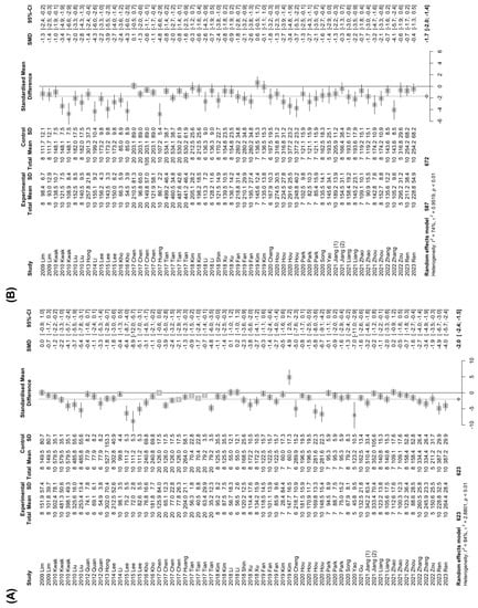 According to the information in the included studies, various animal models were used to induce NAFLD, such as HFD, MCD, the HFHS diet, or db/db mice. Depending on the method and duration of the experimental model, the severity and mechanisms by which NAFLD is induced may differ. Since chronic HFD feeding is widely used to study NAFLD and is well matched with the pathophysiology of human NAFLD patients [], subgroup analysis was conducted with studies using the HFD-induced NAFLD model. A total of 16 studies with 850 animals reported systemic ALT levels with high heterogeneity (I2 = 82%, p < 0.01), and the Panax ginseng treatment significantly reduced ALT levels in the HFD-induced NAFLD animal model (SMD: −2.33 mg/dL; 95% CI: −2.82 to −1.85 mg/dL; p < 0.0001) (Figure 5A). In addition, AST levels were also notably decreased by Panax ginseng treatment (SMD: −3.16 mg/dL; 95% CI: −4.43 to −1.90 mg/dL; p < 0.0001) (Figure 5B), implying possible involvement of Panax ginseng in hepatoprotective effects in HFD-induced NAFLD.