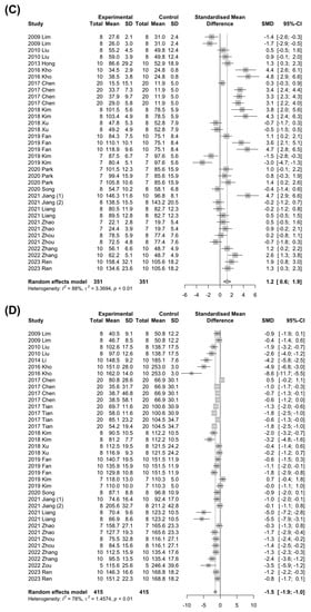 In the development of NAFLD, dysregulation of hepatic lipid metabolism is a characterized phenotypic change, accompanying an abnormal increase in the systemic TG, TC, and LDL levels, while HDL levels are decreased []. Therefore, studies that involved changes in TG, TC, LDL, or HDL levels by Panax ginseng treatment in NAFLD-induced animals were investigated. A total of 32 studies with 1246 animals or 29 studies with 1259 animals were analyzed for the efficacy of Panax ginseng on TG or TC levels, respectively. Of note, the Panax ginseng treatment significantly lowered TG (SMD: −2.86 mg/dL; 95% CI: −3.70 to −2.02 mg/dL; p < 0.0001) and TC (SMD: −1.69 mg/dL; 95% CI: −1.99 to −1.40 mg/dL; p < 0.0001) levels in NAFLD-induced animals with high heterogeneity (TG: I2 = 84%, p < 0.01; TC: I2 = 74%, p < 0.01) (Figure 4A,B). To explore the effects of Panax ginseng on hepatic cholesterol metabolism in detail, changes in HDL and LDL levels in NAFLD-induced animals were evaluated. A total of 18 studies and 702 animals measured HDL levels, which were significantly elevated by Panax ginseng treatment (SMD: 1.22 mg/dL; 95% CI: 0.59 to 1.85 mg/dL; p = 0.0002) with strong heterogeneity (I2 = 88%, p < 0.01) (Figure 4C). Contrary to the results of HDL levels, LDL levels were remarkably decreased by Panax ginseng treatment in NAFLD-induced animals (SMD: −1.46 mg/dL; 95% CI: −1.89 to −1.03 mg/dL; p < 0.0001) (Figure 4D). These data suggest that Panax ginseng may improve hyperlipidemia by regulating hepatic lipid metabolism in NAFLD-induced animals.