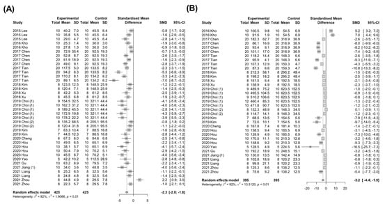 Persistent overload of nutrients and inflammatory cues instigate liver injury, one of the cardinal features of NAFLD []. Therefore, the effects of Panax ginseng on the systemic levels of liver injury markers (ALT and AST) in animal models of NAFLD were examined. In the analysis of ALT, a total of 30 studies with 1358 animals were analyzed (Figure 3A). Since the results showed a high degree of heterogeneity between the experimental and control groups (I2 = 81%, p < 0.01), the random-effects model was selected for further investigation (Figure 3A). Interestingly, a notable decrease in ALT levels by the Panax ginseng treatment was found in NAFLD-induced animals (SMD: −2.15 IU/L; 95% CI: −2.50 to −1.79 mg/dL; p < 0.0001) (Figure 3A). Next, to explore the effects of Panax ginseng on AST levels, 26 studies with 1166 animals that reported AST levels were analyzed with strong heterogeneity (I2 = 90%, p < 0.01) (Figure 3B). Similar to the results from ALT, Panax ginseng administration significantly reduced AST levels in NAFLD-induced animals (SMD: −2.86 IU/L; 95% CI: −3.70 to −2.02 mg/dL; p < 0.0001) (Figure 3B). These results may suggest that Panax ginseng could attenuate NAFLD-induced liver injury in a preclinical model.