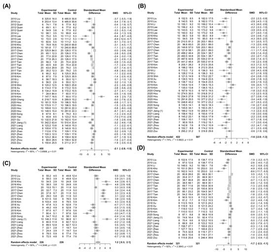 The effect of Panax ginseng on hepatic lipid metabolism in NAFLD-induced animals. Forest plots for comparison: (A) Triglyceride (TG) levels [,,,,,,,,,,,,,,,,,,,,,,,,,,,,,,]. (B) Total cholesterol (TC) levels [,,,,,,,,,,,,,,,,,,,,,,,,,,,,]. (C) High-density lipoprotein (HDL) levels [,,,,,,,,,,,,,,,,,]. (D) Low-density lipoprotein (LDL) levels [,,,,,,,,,,,,,,,,,,]. SD, standard deviation.