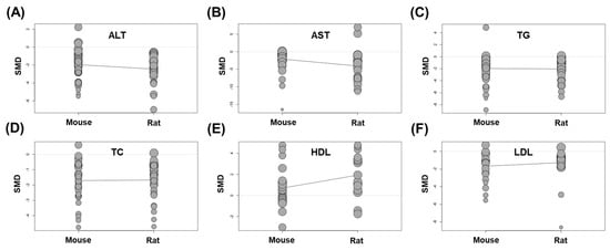 In the present meta-analysis, the animal species used for the study is another variable. Among the total of 41 animal studies, mice or rats were used in 30 (73.2%) or 11 studies (26.8%), respectively. To find out whether the effect of Panax ginseng differs depending on the animal species, a meta-regression test was performed by dividing groups of mice and rats. As a result, all factors related to liver injury (ALT and AST) or lipid metabolism (TG, TC, HDL, and LDL) did not show significant linear associations according to animal species (p in ALT = 0.184; p in AST = 0.069; p in TG = 0.867; p in TC = 0.909; p in HDL = 0.051; p in LDL = 0.361) (Figure 7A–F). These data may indicate that the animal species used in the meta-analysis could be a factor in increasing heterogeneity, but did not affect the overall protective effects of Panax ginseng in NAFLD-induced animals.