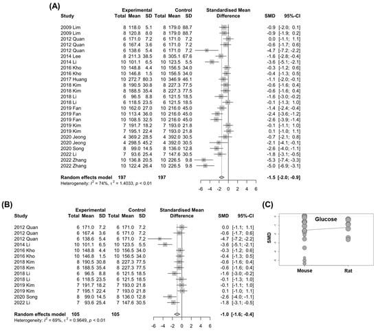 Impaired glucose tolerance and insulin resistance are considered crucial hepatic manifestations in the progression of NAFLD []. Therefore, studies reporting fasting blood glucose levels were subjected to analysis. A total of 14 studies with 394 animals with high heterogeneity (I2 = 74%, p < 0.01) were analyzed to investigate the overall effect of Panax ginseng on fasting blood glucose levels (Figure 8A). As expected, a random-effects model demonstrated that Panax ginseng treatment significantly reduced fasting blood glucose levels compared to the control groups (SMD: −1.45 mg/dL; 95% CI: −1.99 to −0.92 mg/dL; p < 0.0001) (Figure 8A). In addition, the subgroup analysis with the HFD-induced NAFLD model also presented diminished fasting blood glucose levels by Panax ginseng treatment (SMD: −0.99 mg/dL; 95% CI: −1.60 to −0.38 mg/dL; p = 0.0014) (Figure 8B). Moreover, there was no difference in the hypoglycemic effect of Panax ginseng according to animal species (p in fasting blood glucose = 0.599) (Figure 8C).