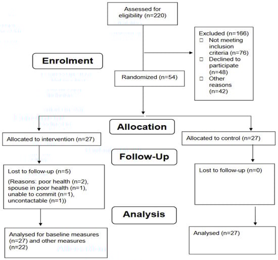 The recruitment pathway of this study is summarised in Figure 2 (CONSORT diagram). A total of 220 dental patients were screened for eligibility; 76 patients did not meet the inclusion criteria, and 48 patients declined to participate for the following reasons: no interest in changing diet (n = 22); poor health (n = 10); eat healthily already (n = 3); and too busy/too many commitments (n = 13). Other reasons for exclusion (n = 42) included uncontactable (n = 36); death (n = 1); reason unrecorded (n = 2); and dropouts prior to randomisation (n = 3).