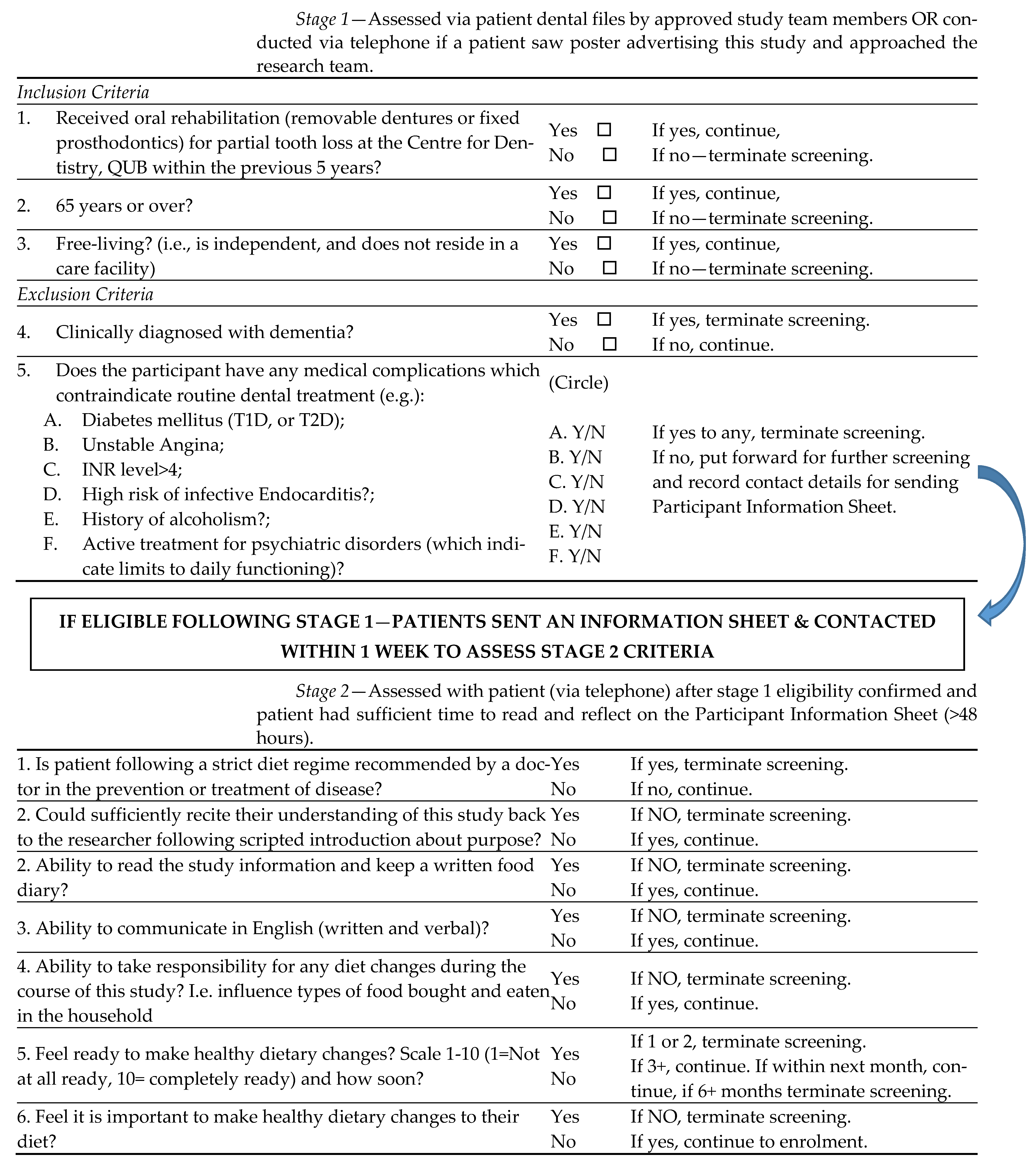 - McCrum, L.A.; Watson, S.; McGowan, L.; McGuinness, B.; Cardwell, C.; Clarke, M.; Woodside, J.V.; McKenna, G. Development and feasibility of a tailored habit-based dietary intervention coupled with natural tooth replacement on the nutritional status of older patients. Pilot Feasib. Stud. 2020, 6, 120. [Google Scholar] [CrossRef]