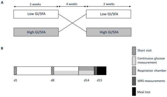 Study protocol. (A) Participants participated in two dietary interventions in a randomized order; a two-week high-GI/SFA diet and a two-week low-GI/SFA, interspersed by a four-week washout. (B) At the end of each dietary intervention, volunteers visited the university for study measurements (days 14–15). At the start and after one week of each of the intervention periods, participants visited the research facilities for instructions and body weight and food intake evaluation (short visits d1 and d8).