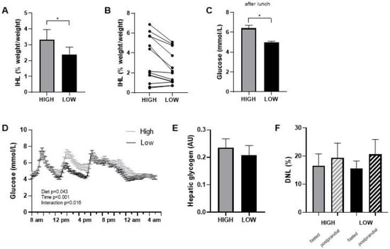 Intrahepatic lipid content (IHL) after a two-week high- or low-GI/SFA diet. (A) IHL content mean ± SEM. (B) individual IHL data (n = 13). (C) Average glucose in interstitial fluid over the 3 h following lunch (n = 10). (D) Continuous glucose measurements during standardized day 14 in the respiration chamber, after two weeks of a low-GI/SFA or high-GI/SFA diet. (E) Hepatic glycogen comparison after the low and high-GI/SFA diets, arbitrary units (AU) (n = 10). (F) DNL as the percent of newly synthesized palmitate within the VLDL fraction in fasted state and after a 4 h meal test (postprandial). * p < 0.05.