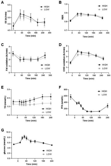 Energy expenditure, substrate oxidation, and plasma values during meal test after two weeks of a high- or low-GI/SFA diet. (A) Energy expenditure (EE). (B) Respiratory exchange ratio (RER). (C) Fat oxidation. (D) Carbohydrate (CHO) oxidation during the meal test after two weeks of a high- or low-GI/SFA diet (n = 10). (E) Plasma triglycerides levels, significant effect of diet and diet × time p < 0.05. (F) Plasma-free fatty acids. (G) Plasma glucose (n = 10).