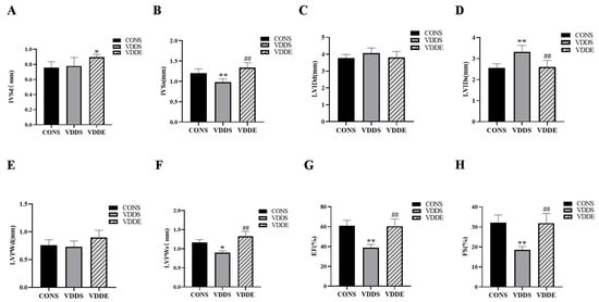 Heart ultrasound-related data in mice after the intervention period. (A) IVSd, (B) IVSs, (C) LVIDd, (D) LVIDs, (E) LVPWd, (F) LVPWs, (G) EF, (H) FS. n = 6; * p < 0.05 vs. CONS group, ** p < 0.01 vs. CONS group; ## p < 0.01 vs. VDDS group.