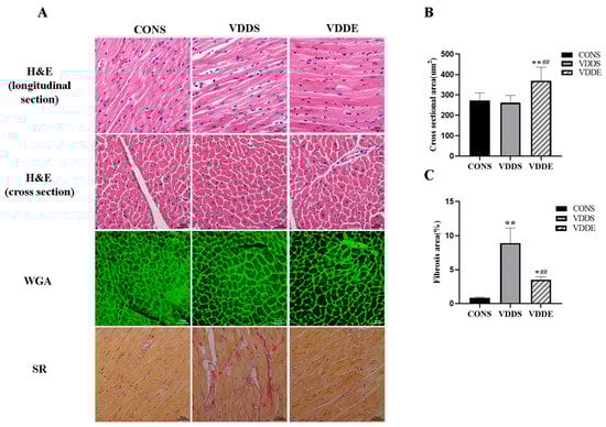 H&E, WGA, and SR staining and statistical results for left ventricular myocardium after the intervention period. n = 3; (A) H&E, WGA, and SR staining of the left ventricular myocardium, ×400, Bar = 20 μm, the red arrows indicate areas of fibrosis, (B) Myocardial CSA statistics, and (C) SR staining statistics. * p < 0.05 vs. CONS group, ** p < 0.01 vs. CONS group, ## p < 0.01 vs. VDDS group.