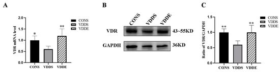VDR mRNA expression was significantly higher in the CONS (p < 0.05) and VDDE (p < 0.01) groups than in the VDDS group. Western blotting results showed that VDR protein expression was significantly higher in the CONS and VDDE groups than in the VDDS group (p < 0.01) (Figure 5).
