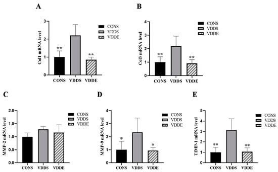 mRNA expression of myocardial fibrotic factors after the intervention period. n = 6; (A) Col1, (B) Col3, (C) MMP-2, (D) MMP-9, and (E) TIMP-1 expression. * p < 0.05 vs. VDDS group, ** p < 0.01 vs. VDDS group.