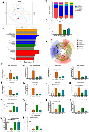 The intervention of SFN improves gut dysbiosis induced by the HFHFr diet. (A) Nonmetric multidimensional scaling (NMDS) plot based on the Bray–Curtis distance. (B) The relative abundance of the top ten abundant bacteria at the phylum level. (C) The ratio of Firmicutes/Bacteroidota. (D) Linear discriminate analysis effect size (LEfSe) analysis of the dominant biomarker taxa among the four groups. The threshold of the logarithmic score of LDA analysis was 4.0. (E) Taxonomic cladogram obtained from LEfSe analysis by comparing 4 groups. (F–S) Relative abundances of 14 significantly altered bacterial genera or families: (F) Streptococcaceae, (G) Desulfovibrionaceae, (H) Lactococcus, (I) Desulfovibrio, (J) Blautia, (K) Dubosiella, (L) Alistipes, (M) Lactobacillus, (N) Butyricicoccaceae, (O) Coriobacteriaceae UCG_002, (P) Alloprevotella, (Q) Lachnospiraceae_NK4A136_group, (R) Butyricicoccus, and (S) Bifidobacterium. Data are presented as mean ± SEM (n = 6). * p < 0.05, ** p < 0.01, *** p < 0.001 compared with HFHFr.