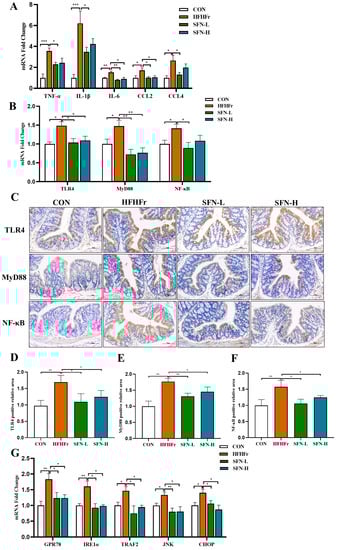 Loss of barrier integrity may promote intestinal inflammation [40]. We found that the mRNA levels of pro-inflammatory cytokines TNF-α, IL-1β, and IL-6 and chemokines CCL2 and CCL4 were significantly increased in the HFHFr group, but these inflammatory mediators were decreased in SFN groups (Figure 4A). Prior studies have largely focused on that, as LPS is a major pathogenic factor in the process of intestinal inflammation, it binds to TLR4 and activates the NF-κB pathway, causing an inflammatory response [28]. Intriguingly, the mRNA expressions of TLR4, MyD88, and NF-κB were significantly increased in the HFHFr group, and the intervention of SFN significantly reversed the elevation of these genes (Figure 4B). As demonstrated in Figure 4C–F, the intervention of SFN inhibited the activation of the TLR4/NF-κB signaling pathway in colon tissue. SFN may help to regulate inflammation and immune function by inhibiting the activation of the colonic TLR4/NF-κB pathway to reduce intestinal mucosal inflammation and colonic mucosal damage.