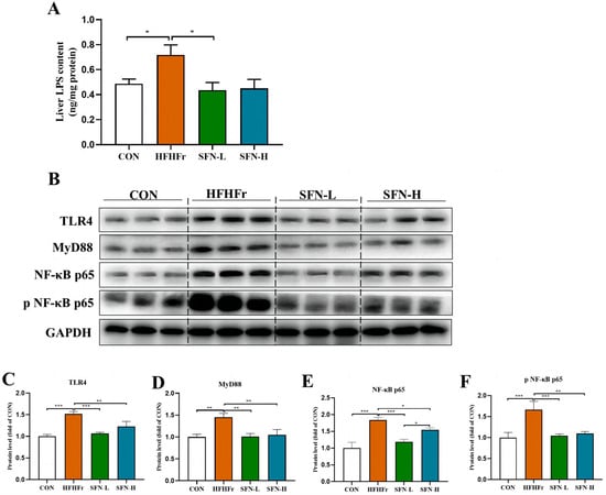 Disrupted gut barriers lead to LPS leakage into the circulation through gut enterocytes towards the liver through the portal vein due to increased gut permeability. Hence, we detected the LPS levels in the mice livers by ELISA. As shown in Figure 5A, SFN treatment significantly reduced the LPS level in the liver. The ability to recognize the increased LPS, TLR4 and their downstream pathway has shown dominance in the mechanisms of the microbiota-gut-liver axis [42]. LPS is a key factor in inducing an inflammatory response in liver tissue and plays an important role in liver injury through the LPS-TLR4 signaling pathway [43]. Interestingly, SFN inhibited LPS-triggered TLR4/NF-κB signal pathway activation, as evidenced by decreased protein expressions of TLR4, MyD88, and NF-κB (Figure 5B–E). The activation of NF-κB is responsible for downstream inflammatory cytokines synthesis, and we further found that SFN inhibited phosphorylation of NF-κB (Figure 5B,F). As a downstream transcription factor of the TLR4 pathway, NF-κB is responsible for stimulating the production of major pro-inflammatory cytokines [44], and the generation of TNF-α, IL-1β, and IL-6 in the livers was confirmed in Figure 1G,H. Therefore, these results suggest that SFN intervention can improve the hepatic inflammation of NAFLD by reducing LPS translocation and inhibiting the activation of its downstream TLR4/NF-κB signaling pathway.
