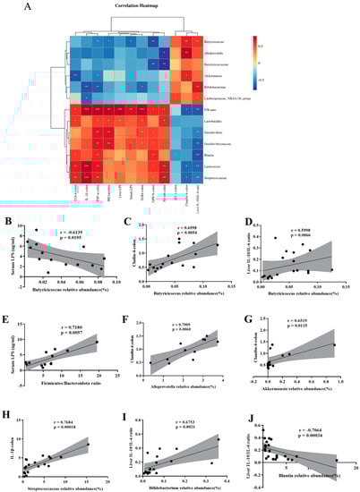 Spearman correlation analysis supports that SFN ameliorates HFHFr mice via the microbe–gut–liver axis. (A) Heatmap of the association between microbiota and some other experimental results. The intensity of the color is proportional to the intensity of the Spearman correlation. (B) Serum LPS levels were negatively correlated with the relative abundance of Butyricicoccus. (C) Relative mRNA expression of Claudin-4 in the colon was positively correlated with the relative abundance of Butyricicoccus. (D) IL-10/IL-6 ratio in the liver measured by ELISA was positively correlated with the relative abundance of Butyricicoccus. (E) Serum LPS levels were positively correlated with the Firmicutes/Bacteroidota ratio. (F) Relative mRNA expression of Claudin-4 in the colon was positively correlated with the relative abundance of Alloprevotell. (G) Relative mRNA expression of Claudin-4 in the colon was positively correlated with the relative abundance of Akkermansia. (H) Relative mRNA expression of IL-1β in the colon was positively correlated with the relative abundance of Streptococcaceae. (I) IL-10/IL-6 ratio in the liver measured by ELISA was positively correlated with the relative abundance of Bifidobacterium. (J) IL-10/IL-6 ratio in the liver measured by ELISA was negatively correlated with the relative abundance of Blautia. * p < 0.05, ** p < 0.01, *** p < 0.001 compared with HFHFr.