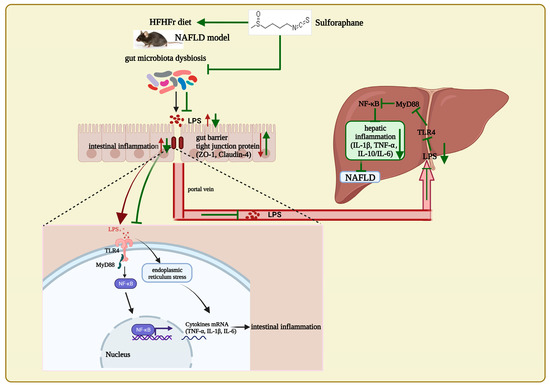 In mice with NAFLD induced by a high-fat, high-fructose diet, SFN supplement improves the compositions of gut microbes, increases the intestinal tight junction protein ZO-1, reduces serum LPS, and inhibits LPS/TLR4 and ERS pathway to reduce intestinal inflammation. Thus, SFN protects the intestinal integrity in NAFLD mice and declines the gut-derived LPS translocations to the liver. Moreover, SFN reduces the liver LPS level and inhibits the LPS/TLR4 pathway activations, thus inhibiting the pro-inflammatory cytokines and alleviating liver inflammation to improve NAFLD.