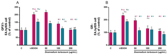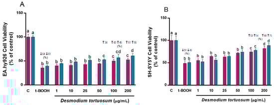 Cytoprotective effects by D. tortuosum extract on EA.hy926 (A) and SH-SY5Y (B) cells after co-treatment (red bars, █) and pre-treatment (blue bars, █) periods. Data are presented as % control, and as mean ± SEM of six independent experiments. a,b,c,d Different letters show significance between groups at p < 0.05. ↓ represents percentage decrease with respect to control, ↑ represents percentage increase with respect to t-BOOH.