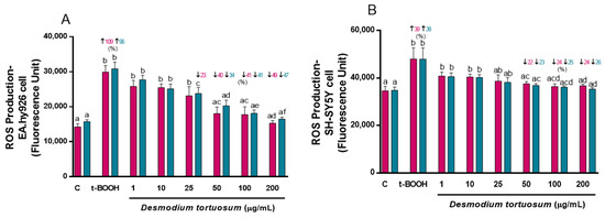 The addition of t-BOOH to cell cultures induced a remarkable increase in ROS generation of around 100% in EA.hy926 and around 40% in SH-SY5Y cells, very similar for both types of treatments, ensuring the reliability of the model for oxidative damage (Figure 2). The same extract concentrations (1–200 µg/mL) tested for cell viability were also assayed for their ROS-quenching capacity. Similar to the assay of cell viability, a significant dose-dependent reduction in ROS production was observed with increasing doses of the extract and, in the case of EA.hy926 cells, a decline in ROS almost to control pre-stress values was reached with the highest tested concentration of 200 µg/mL of D. tortuosum extract (Figure 2A). The two highest extract concentrations, 100 and 200 µg/mL, were also efficient in preventing ROS overproduction induced by t-BOOH in SH-SY5Y cells. The results clearly indicate that both co- and pre-treatment with extracts from D. tortuosum in the range of 50–200 µg/mL, significantly reduced ROS production induced by oxidative stress in these two cell lines (Figure 2).