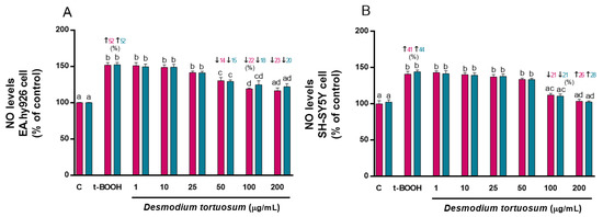 When t-BOOH was added to cell cultures, an increase in NO levels was observed in EA.hy926 (around 50%) and SH-SY5Y cells (around 40%) (Figure 3), while the extracts of D. tortuosum in the highest doses prevented the effect of t-BOOH. In EA.hy296 cells, doses of 50, 100, and 200 µg/mL of D. toruosum reduced NO levels that were previously induced by t-BOOH; and in SH-SY5Y cells this effect could only be observed with the 100 and 200 µg/mL doses of D. tortuosum (Figure 3).