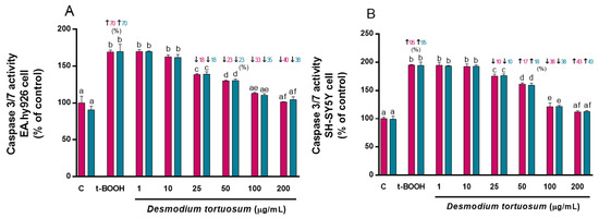 The capacity of D. tortuosum extract to reduce the apoptotic effects produced by t-BOOH was evaluated. The activity of the caspase 3/7 enzyme was increased by the effect of t-BOOH in EA.hy926 cells by 70% (co- and pre-treatment), and in SH-SY5Y cells by 95% (co- and pre-treatment) (Figure 4). D. tortuosum was able to reduce the apoptotic activity induced by t-BOOH in both cell lines from doses of 25, 50, 100, to 200 µg/mL; this effect was similar for both co- and pre-treatment with D. tortuosum (Figure 4).