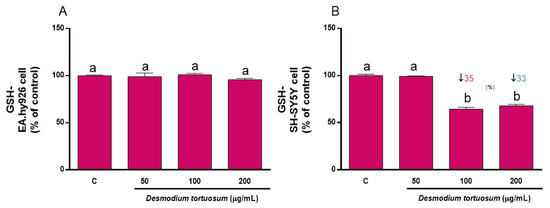 Direct effect of D. tortuosum extract on GSH levels in EA.hy926 (A) and SH-SY5Y (B) cells after a 22 h of treatment period. GSH levels was determined as % of control-change, and represent the mean ± SEM of four independent experiments. a,b,c Different letters show significance between groups at p < 0.05. ↓ represents percentage decrease with respect to control.
