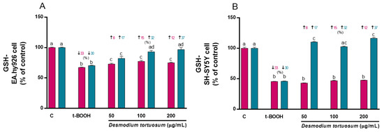 Effect of D. tortuosum extract on GSH levels altered by t-BOOH in EA.hy926 (A) and SH-SY5Y (B) cells after co-treatment (red bars, █) and pre-treatment (blue bars, █). GSH levels were determined as % of control-change, and represent the mean ± SEM of four independent experiments. a,b,c,d Different letters show significance between groups at p < 0.05. ↓ represents percentage decrease with respect to control, ↑ represents percentage increase with respect to t-BOOH.