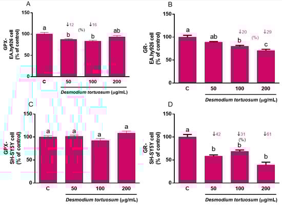 Direct effect of D. tortuosum extract on GPX and GR activities in EA.hy926 (A,B) and SH-SY5Y (C,D) cells after a 22 h of treatment period. GPX and GR activities were determined as % of control-change, and represent the mean ± SEM of four independent experiments. a,b,c Different letters show significance between groups at p < 0.05. ↓ represents percentage decrease with respect to control.
