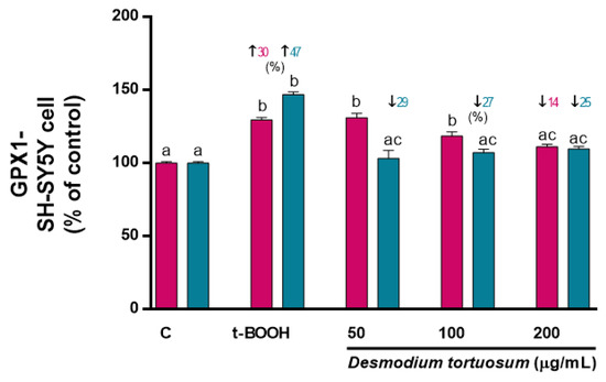Effect of D. tortuosum extract on GPx altered by t-BOOH on SH-SY5Y cells after co-treatment (red bars, █) and pre-treatment (blue bars, █) periods. Data represent the mean ± SEM of three independent experiments. a,b,c Different letters show significance between groups at p < 0.05. ↑ represents percentage increase with respect to control, ↓ represents percentage decrease with respect to t-BOOH.