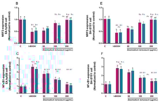 Effect of D. tortuosum extract (50, 100, and 200 µM) on the expression of oxidative-antioxidative genes (SOD2, NRF2, NFκB1) in EA.hy926 (A–C) and SH-SY5Y (D–F) cells after 24 h co-treatment (red bars, █) and pre-treatment (blue bars, █) periods. The gene expression was determined as control-normalized value, and represented as the mean ± SEM of four independent experiments. a,b,c,d Different letters show significance between groups at p < 0.05. ↓ represents percentage decrease or ↑ represents percentage increase with respect to control or with respect to t-BOOH.