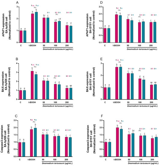 Effect of D. tortuosum extract (50, 100, and 200 µM) on the expression of cell death genes (APAF-1, BAX, Caspase3) in EA.hy926 (A–C) and SH-SY5Y (D–F) cells after 24 h co-treatment (red bars, █) and pre-treatment (blue bars, █) periods. The gene expression was determined as control-normalized values, and is represented the mean ± SEM of four independent experiments. a,b,c,d,e Different letters show significance between groups at p < 0.05. ↓ represents percentage decrease or ↑ represent percentage increase with respect to control or with respect to t-BOOH.